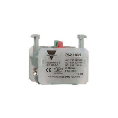 Контактный блок Carlo Gavazzi типа PA2 поддерживает конфигурации двухполюсного однопозиционного переключателя (DPST), доступные с 2 нормально разомкнутыми контактами, 2 нормально замкнутыми контактами или 1 нормально замкнутым контактом + 1 нормально разомкнутым контактом. Твердое серебро является стандартным материалом контактов, для контактных частей используется медь, а корпус переключателя изготовлен из поликарбоната. Контактный блок работает при минимальной коммутационной мощности 100 мА (ток) и 24 В (напряжение).